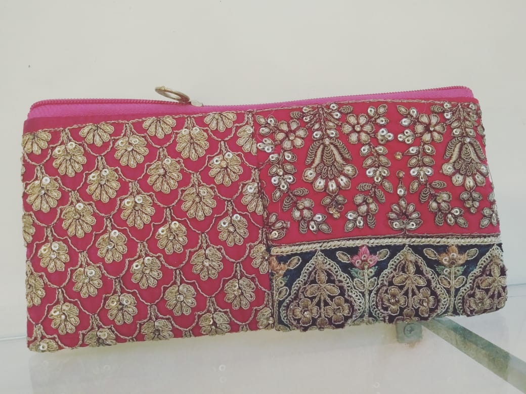 Elevate your ethnic look with this vibrant pink clutch adorned with golden floral motifs and sequin accents.