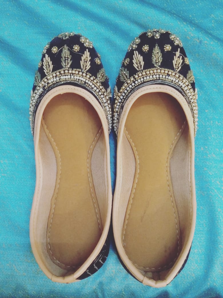 ? Royal Heritage Style Black velvet base pe golden and silver thread aur beads se ki gayi detailing is jutti ko traditional yet glamorous banati hai.