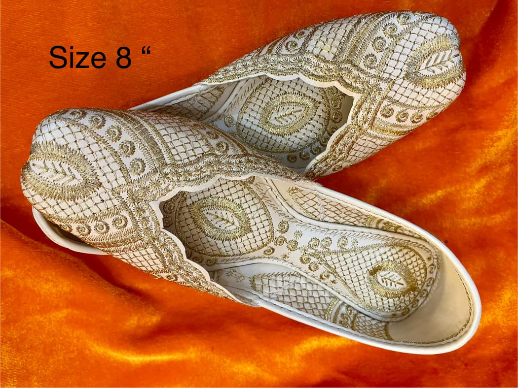 This cream-colored jutti features golden thread embroidery with a net-like pattern