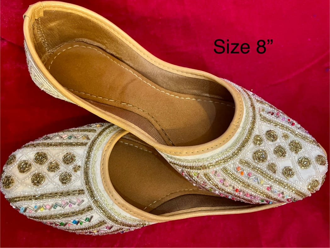 :  Color: White base with golden and multicolor embellishments Handcrafted bead and sequin work Comfortable padded inner sole Traditional Punjabi jutti design Ideal for adding a royal finishing touch to your outfit!