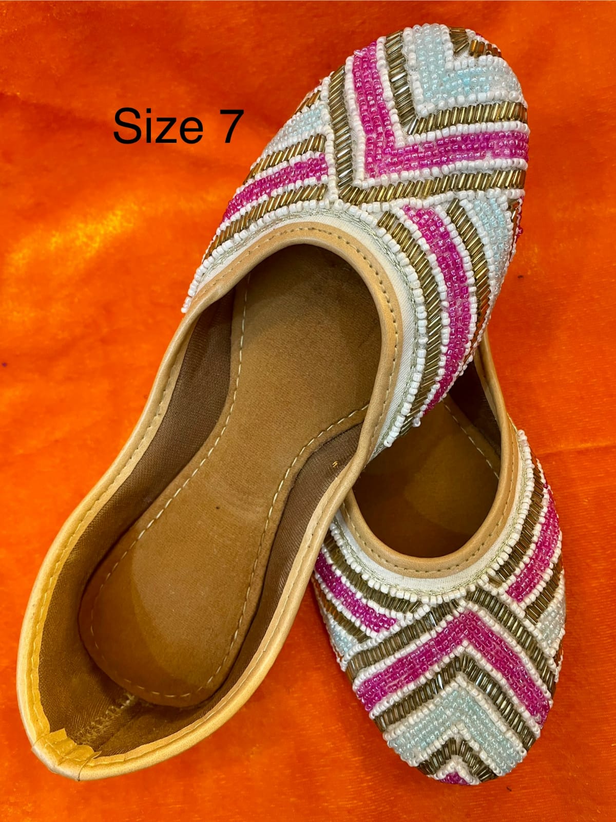 Design: Chevron-style beadwork in gold, white, pink, and lavender tones.